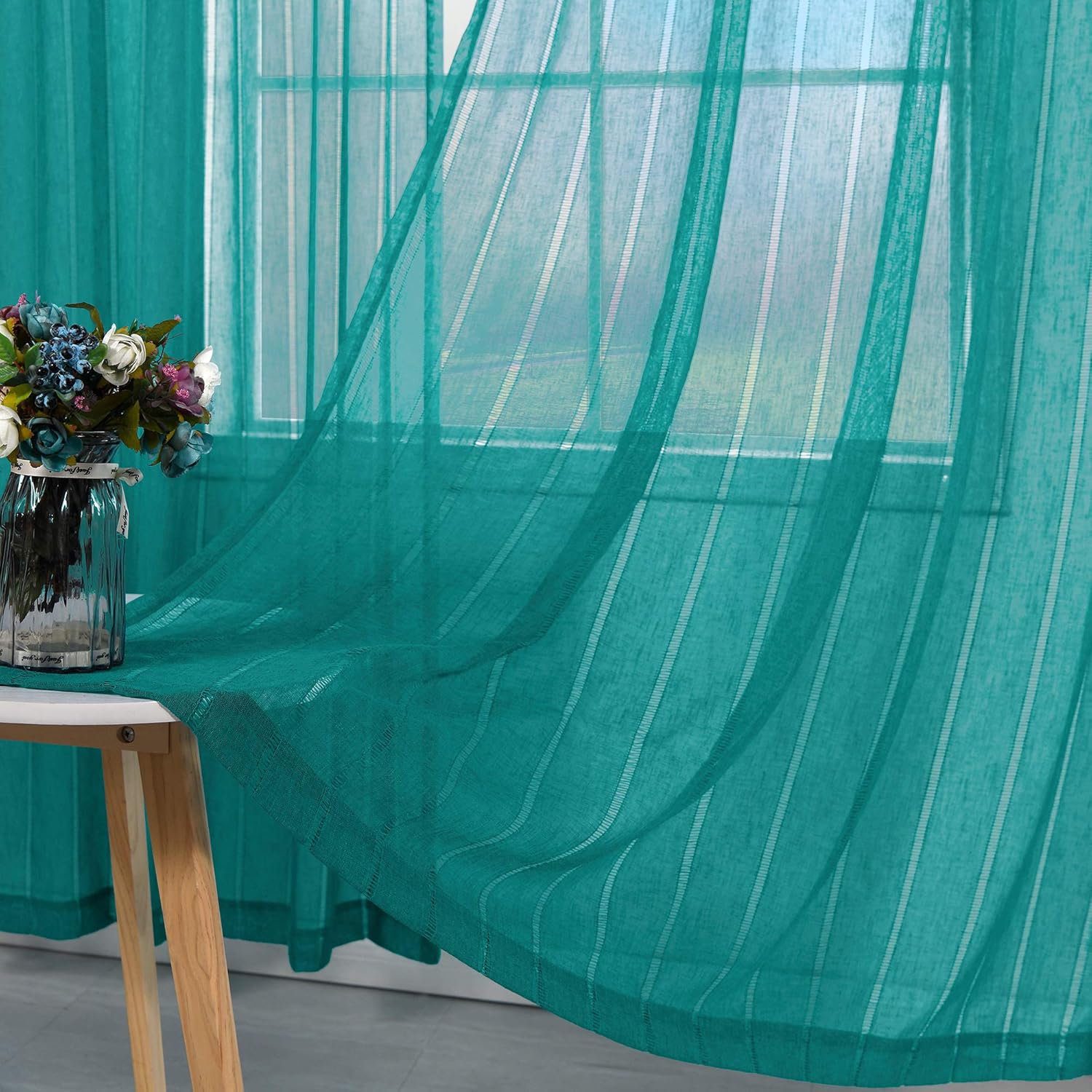 Amazon Com Teal Curtains 45 Inch Length For Bathroom Windows Rod Pocket 2 Panels Linen Look Coastal Beach Decor Striped Short Curtain Sheer For Half Window Treatment Small Area Kitchen 52x45 Inches Length